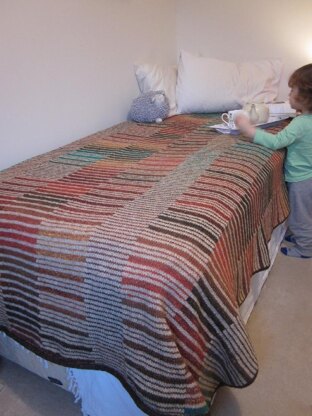 The blanket is composed of long strips knitted individually and sewn together. Magically, the stripes in the strips match horizontally, while letting the colours flow at different pace along each (and within some) of the strips.