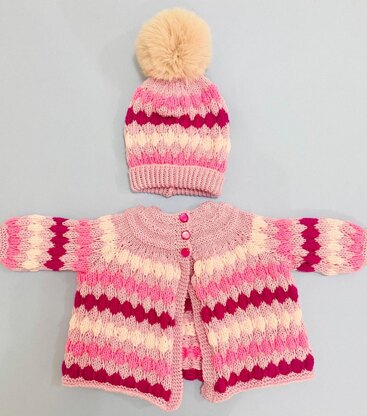 Introducing the Stripy Bubble Matinee Jacket and Hat Set. This enchanting set promises to swaddle your bundle of joy in a delicate layer of warmth. With its intricate bubble pattern, stripy pattern and soft hues, it's a perfect knitting project for those cherished quiet moments at home.