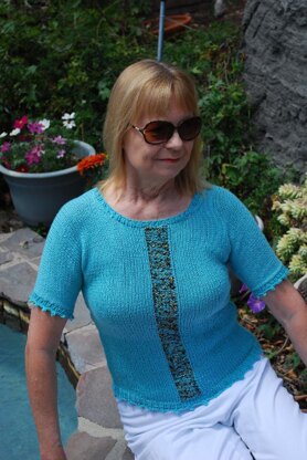This top is knit in one flat piece with a close fit using Rowan Softknit Cotton for the body and Sirdar Firefly metallic ladder yarn as an added accent on the center panel. There are complete directions for front and back, not just the words “reverse shaping”. The picot edging is optional and their are optional directions for a matching center panel down the back. The sides are seamed. The neckline and sleeve edges are picked up and worked from garment body. Directions are in centimeters and inches and includes a schematic.
