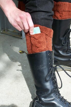 Subway Socks are a quick knit with worsted weight yarn. They have a graceful plait running up the sides and a surprise pocket. The pocket is closed by folding over the ribbing of the sock. A handy spot for a bus pass or coffee money when you’re travelling light.