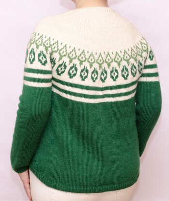 El jersey se teje de arriba hacia abajo, en redondo, método conocido en los patrones en inglés como “top-down”, con agujas circulares y sin costuras. Las mangas también se trabajan de arriba hacia abajo, sin costuras, a partir de los puntos que quedan en espera tras separarlas del cuerpo del jersey. Un dibujo sencillo y unas rayas hacen que este jersey sea muy vistoso.