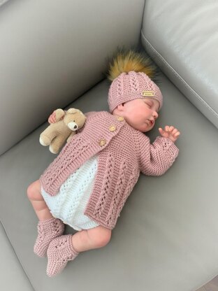 This modern 4 piece set can be made in 8 sizes from premature to 24-month-old baby. The cardigan is knitted from the top down on straight needles so requires little sewing. The romper is knitted in two pieces front and back from the bottom up. The little booties and hat complete the set.