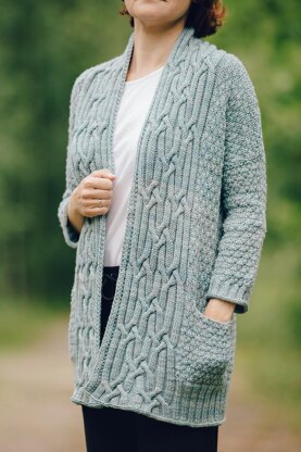 Cables, texture and pockets in worsted weight yarn – all you need from a cardigan. Wrap yourself in this blanket size cardigan which is knitted seamlessly from top down.