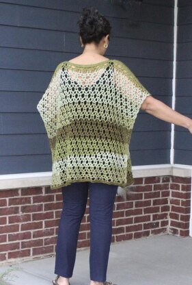 A beautiful, lacy and open pattern that works up really quickly! A poncho that works well as a Spring/Summer accessory over shorts, a sleeveless dress, crop pants, etc.! Or wear it as a swimsuit cover! Will work beautifully with a single color yarn as well as a multi colored yarn.