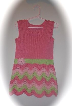 Easy lacy scallops, a decorative "sash," and a simple bodice decorated with a pretty crocheted flower.... Use heavy fingering weight for a Size 2, and DK weight for a Size 4 (toddler).... An easy knit for a dropped-waist summer dress for Little One!