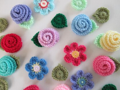 The pattern is written using US crochet terms. It shows you how to create a rose, flower and leaf. You will need to have basic crochet and sewing skills.