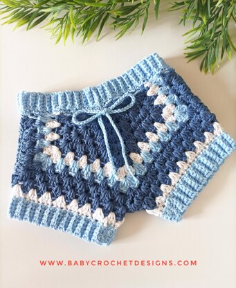 These shorts are made from two granny squares that are worked in turned rows. They are then joined and some ribbing added at the waist and legs. The colours can be changed when you like, these are great for using up your cotton scraps!
