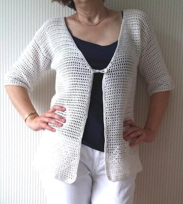 This fashionable jacket is worked using the traditional technique: filet crochet. A very pretty lacy pattern with a stylish diamond motif is easy to make:only what you need to know is how to make a chain stitch, slip stitch and double crochet.