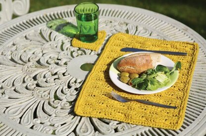 This is a pattern for a summer lace placemat and coaster, originally published in Knitting magazine. It has a lace pattern and garter stitch edges on the placemat and the coaster. Photos Knitting magazine.