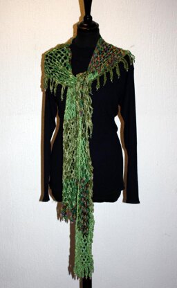 In diesem leichten Sommergarn sind mehrere edle Garne miteinander kombiniert. Daher sollte das Muster nicht von den Garnen ablenken und dennoch mit den Perlen und den asymmetrisch angeordneten Fransen den Schal elegant wirken lassen.
