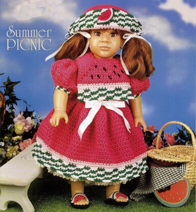 Summer Picnic, #2497. Here’s our girl all ready for a picnic in the park sporting her watermelon-themed ensemble. Crochet pattern leaflet includes instructions to make a dress, sandals, slip, sandals and hat made from cabled cotton (or substitute worsted weight acrylic) with accessories in perle cotton (you may substitute #10 thread). Fits 18” American Girl Dolls, Springfield Dolls, Götz Dolls and similar sized dolls.
