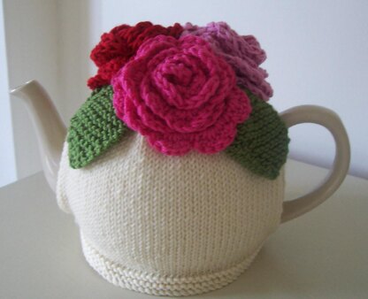 A pretty, summery tea cosy to keep your tea warm. Large crochet roses and leaves adorn the top. Make in the colours of your choice. This tea cosy was featured in a Sunday magazine article on tea cosies in 2013.