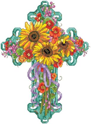 Designed by: Linda Gillum. Bring bright, cheerful spirit into your space with this beautiful cross floral design. This sunflower and nasturtium bouquet set on a copper verdigris cross is sure to fill any room with joy! Makes a perfect gift for any person of faith and love. Goes great with our Spring, Fall and Winter Season Floral Crosses.
