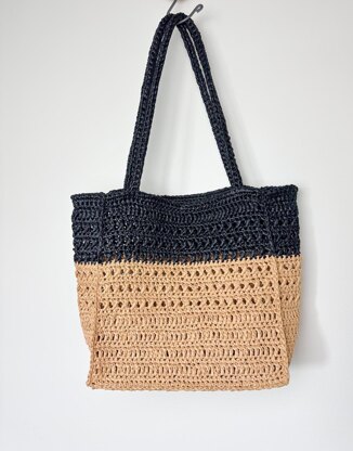 The tote is crafted in separate pieces that are connected later. It starts with tan-colored raffia, and the last third of the length is finished with black-colored raffia. You will need approximately 220 yards (201 meters) in Coal Black and 303 yards (277 meters) in Desert Palm raffia yarn. Suggested yarn: Ra Ra Raffia.