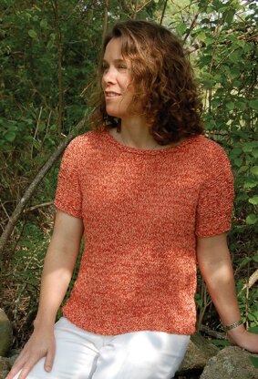 VERY QUICK TO KNIT and worked in one piece, from the hem, with shoulder seams. The top section of the front and back of this summer wardrobe basic are identical, and the body is worked in rounds, beginning at the hem. Fitted sleeves are worked with right and left slant increases and short rows are used for shoulders - instructions included. Hem and cuffs are in rib and the boat neck is finished in reverse Stocking stitch.