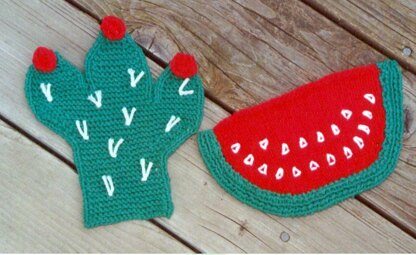 Cute for any kitchen! Knit up the “cactus” or “watermelon” slice! OR knit up both for a cool gift! These are both fast and easy to knit. Such a novelty item, and not your ordinary potholders for sure! Use worsted weight cotton yarns, knitting needles, US # 6 to make them thick and heat resistant. Cactus measures 8½“ tall. Melon slice is 8½” by 5”. Make some not only for friends, but for yourself too! These make up quickly!