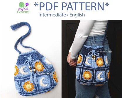 This is a pattern for my sun and moon drawstring crossbody bag! It is detailed and includes many photos for those that are more visual learners! I have classified this pattern to be at an intermediate level, though I think an advanced beginner could give it a try :). Pattern is written in US terms - you should know the following stitches for this pattern: chain, slip stitch, single crochet, half double crochet, double crochet and triple crochet. I use worsted weight level 4 cotton yarn but you are welcome to use any yarn you would like. (Approx 243g/461.7 yds). Dimensions: Length is approx 12” (+ 20" drop for strap); Width is approx 12” (9.5” when closed)