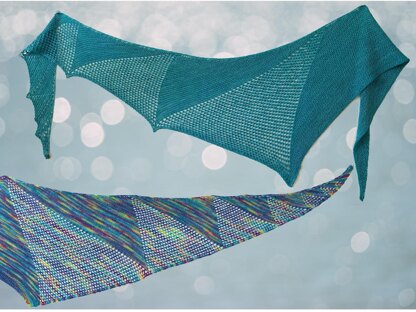 Let everyone see how dazzling you are with the Sun Glitter shawl. This shawl is the perfect complement to variegated yarns yet also sparkles in a solid colour. Worked in your choice of stockinette or garter stitch, the asymmetric triangle breaks up any pooling and creates flashes of colour instead. Triangles of solid fabric alternate with eyelet mesh from the tip to the garter stitch border. The solid sections show off the twinkles of colour while the lace lets the sun shine through.