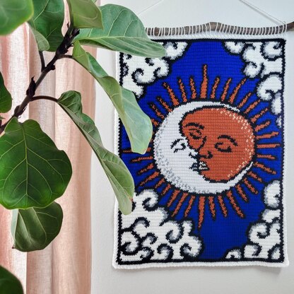 The Cosmic Crush tapestry captures a tender moment between celestial lovers, the sun and moon, locked in a gentle kiss among soft, swirling clouds.