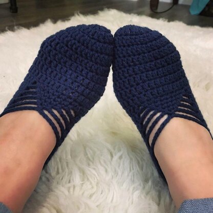 This slippers pattern starts at the toe working in rounds, then in rows until desired length is reached, then around the top to cinch things up!