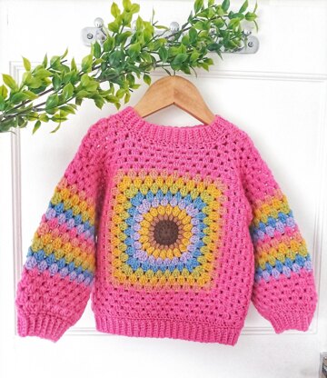 This cute jumper is made with two sunflower granny squares. Then shaping and adding sleeves.