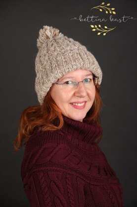Suniel ist eine Mütze mit breiter Krempe, durchgehendem Zopfmuster und Pompon.