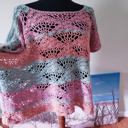 This Tunic is made of a front panel and a back panel that are seamed together. This pattern will also make for an airy and beautiful blanket, shawl or wrap. Instruction are given in the back panel section on how to work a blanket or shawl border