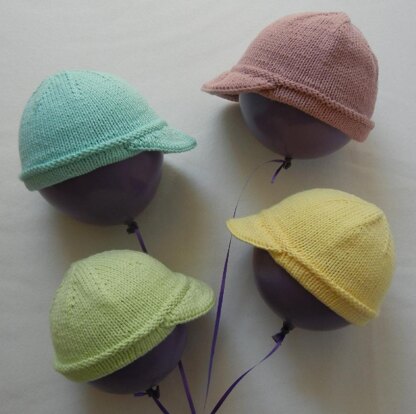 Cute summer beanie in 4 sizes for children, with a brim, spiral shaping on top, and hem. Brim shape is created through geometry, tight gauge and double layers - no cardboard or plastic!