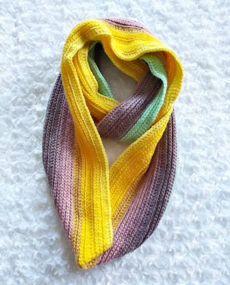 The pattern requires approximately 550 yards of a DK weight yarn in the fiber of your choice to make a scarf which is 5.5" wide across and 52.75" long around in circumference, or 25.75" long when laid flat. (Featured yarn is Lion Brand Mandala in color Valkyrie.) Also needed are a US-G 6/4.00mm crochet hook, tapestry needle, and scissors.