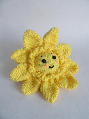 This is a knitted Sunshine Flower, that is designed to cover a chocolate orange. Once the chocolate is all gone, the flower can be used as a decorative item.