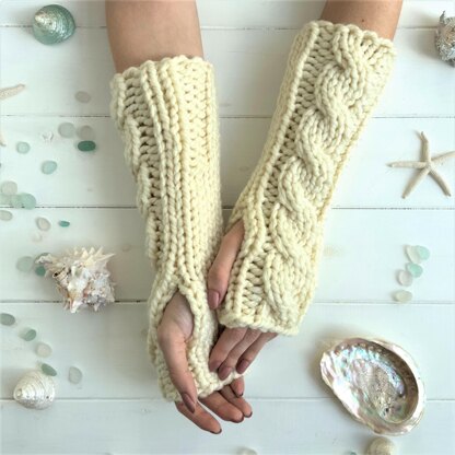 The pattern is easy, with very easy cabling, even if this is your first time! Knitted on 2 needles and sewn up, leaving a gap for the thumb. Instructions are line by line in English, with British/US terms. Each size is written separately.