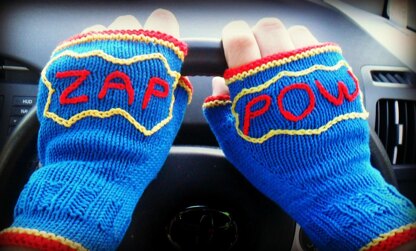 Quick & easy to knit, these cotton fingerless gloves are designed to add a bit of zap, pow & kaboom to your morning commute! Unisex styling, garter edgings, delayed ribbing and an unusual thumb gusset add interest to these practical, machine washable fingerless gloves. Knit in clean bright colours and embellish to suit your superhero preferences! Now sized from Child to large adult.