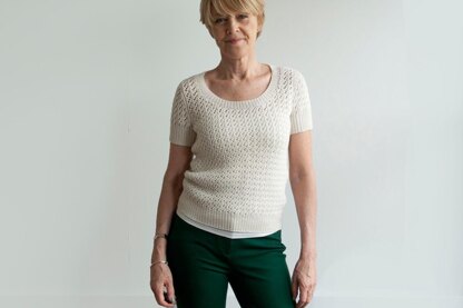 This is Susan – a warm weather tee, perfect for anytime and anywhere. I'm wearing it with jeans today and yesterday it complimented dress slacks and heels for my daughter's baby shower quite nicely! This is a top down, mostly seamless knit. Rib trimming from picked up stitches is worked around its scoop neckline, with a longer variation extending and anchoring its hems. Sleeves are top down too, then worked in the round, and set in after blocking. This design was inspired by the new-to-me waterfall lace – a light and airy, easy to remember 4 stitch by 6 row repeat, that's both visually interesting and satisfying to create. I hope you'll agree. Enjoy!