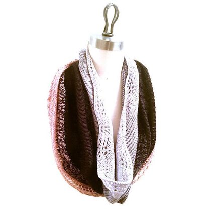 Sway into the rhythm of this marled Ombré stripped knit. Simple to make and easy to wear, this snood is going to be the perfect transition piece from summer to fall, winter to spring. Starting with a lace border, stitches are picked up and the body of the snood is worked in the round alternating between single and double strands of yarn.