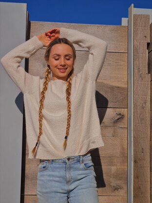 **GARMENT CONSTRUCTION:**This beautiful, understated sweater is worked seamless from the top down with contiguous shoulder construction. Worked flat first then joined at the front neckline and finished, knitted in the round to underarm. Sleeves are separated out and body is finished in the round to hemline. Sleeves are worked in the round. Neckband are finished last
