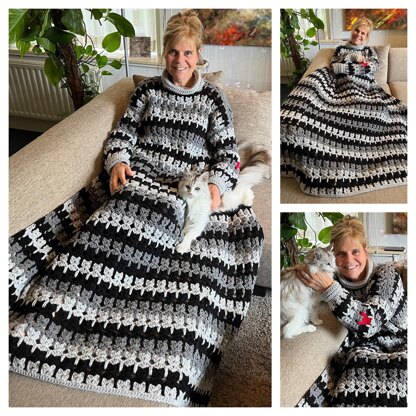 GIVE AND RECEIVE WARMTH! Tired of these increasing energy bills? Well... cuddle up in your own lovely and unique sweaterblanCAT. Great for all catlovers young and young at heart. The pattern is easy and works up fast. Just got settled on the couch and need to get up? No problem, you get in and out in a jiffy; just slide your head and arms out and your free to go :)