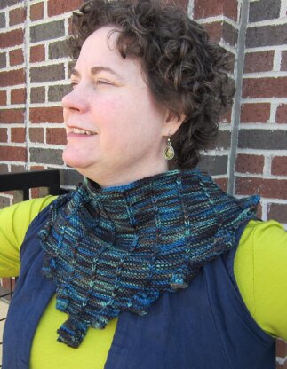 Primarily knit in garter stitch, once completely knit, specific stitches are dropped back to the cast on edge, then chained back up (photo tutorial included of this process) to create vertical lines of stockinette. A button and loop closure attaches the ends at the back of the neck.
