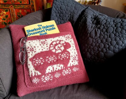 This cushion cover features a colourwork pocket panel. Both are worked in the round, with the cushion cover worked in stocking stitch and the panel stranded with a steek. A buttonband is worked flar over the top edge of the cover in Moss stitch.