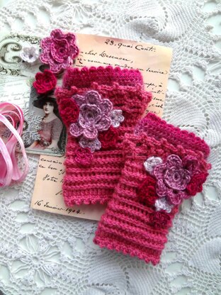 What you need: *worsted yarn and 3mm / US: D hook for the warmers and fingering yarn and 1.7 mm / US: #4 hook for the inner side of warmers * sewing thread for sewing the flowers on and sewing/tapestry needle for weaving ends/tails Stitches: chain (ch), chain space (ch-space), slip stitch (sl st), single crochet (sc), half double crochet (hdc), double crochet (dc), front and back post double crochet (fpdc / bpdc), picot. American terminology used. These warmers are made with two different yarn weights. The warmers are made with worsted yarn and the inner part is made with fine yarn. *Tip: for best effect of the inner part, I recommend you use a variegated yarn.