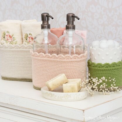 These small, versatile crochet organizer baskets come in 3 different shapes, and a total of 5 written sizes. Use them in your bathroom, or guest bedroom, for storing hand towels and/or washcloths, lotion, shampoo, conditioner, or body wash bottles in. This crochet pattern is available for free on my website or you can download it here as a print-optimized, ad-free PDF for your convenience.