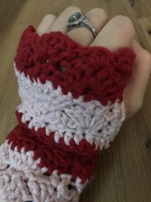 Woman's fingerless gloves for Valentine's Day. Two variations: stripes or solid with contrasting hearts. Can be made with any worsted weight yarn, I chose red heart amore because it is very soft and easy to work with. Gauge not really important, glove should fit comfortably, go up or down a hook size to attain that if needed. One size fits most. Finished glove about 6 inches long and 3 inches wide, but stretchy. Pattern PDF includes written instructions for the two glove versions in American English and images for reference. Feel free to reach out to me (Aria Raymond) with questions at any time.