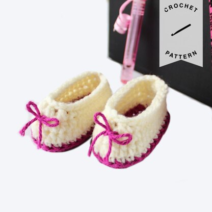 These sweetheart booties are made for babies 0-3 months old. They can be made in one piece using just one color if you like, or you can try out different combinations for the sole and the top of the booties. The little bow on the front of these booties is just a spare length of matching yarn that I tied around the stitch post, but you can customize these any way you like. You could even add little crochet roses or a pretty button to finish them off.