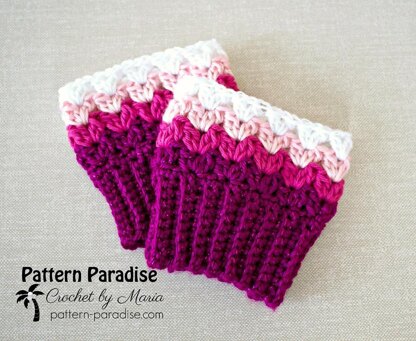 These boot cuffs are so quick to make and pretty in both the graded ombre look as well as just one color. They work up very quickly and add a nice touch to the tops of your boots. They are also a great way to use up small amounts of yarn!
