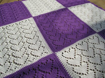 Baby blanket made from sweet squares. Change colors, number of colors and size as you desire. The sample size needed 5 skeins of dark and 4 skeins of light color. Purple color yarn used is no longer available and suggested substitutes are either Cyclamen 095 or Royal 070. This could be a good introduction to lace knitting, both chart and written instructions are included. Have fun!