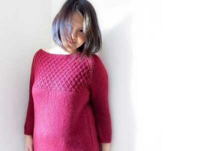 * Boat neck sweater with raglan style sleeves. * Texture stitch at the front from neck to chest. * Soft gather at the center front below texture stitch transitions and at the back above waist. * Three-quarter length sleeves. * Garter stitch for neckline, hem and cuffs.