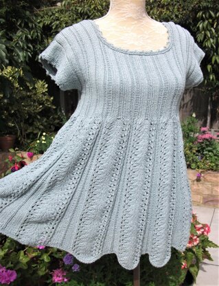 A gorgeous flared tunic! The main part of the body is worked in bands of “old shale” stitch, with easy shaping between. A super scalloped edge is formed on the bottom edge. Lacy sections create the wonderful flared shape - flattering and comfortable to wear. The yoke is worked in a mixed rib, contrasting beautifully with the main part & gives a lovely fit. The cap sleeves and neck borders are finished with a picot edging. For the main part you will need circular needles to hold the stitches until the number reduces. However, the knitting is worked straight in rows, not in the round. So you work back and forth in rows on the circular needle. For the upper section, & until sts reduce, you can then use straight 4 mm needles.