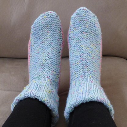 These slipper-socks have a snug fitting rib cuff then the foot is worked in easy garter stitch. Soft and comfy to wear, you’ll never want to take them off! While my pattern is worked in two colours, you can of course work them in just one colour if you prefer.