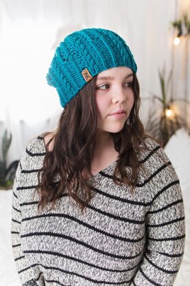 With bold twisted stitches, and cables that run from the brim into the body, the Sylva Slouch is sure to keep you engaged while knitting. When finished, it can be worn slouchy, or with the brim folded up.