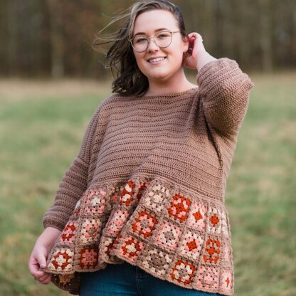 The Sylvia Jumper is smock-style garment that really plays around with contrasting textures and shapes! With a wide neck, drop shoulders and ¾ length sleeves, it’s designed to be a fun garment for all bodies. It’s got a simple upper body, with fun granny squares worked and joined to create the lower part of the smock jumper.