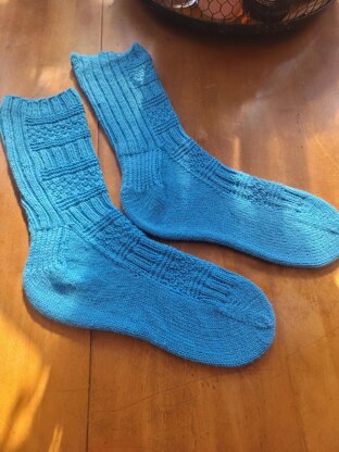 If knitting were music, the stitches would be the keys, and the repeats would be the time signature. If knitting were music, a simple two-by-two rib could be translated into the Key of C (no sharps or flats, just natural notes), in 2/2 time, (or cut time). Changing just a few stitches (the notes) to cables or lace (sharps or flats) the entire musical world is at your knitting fingertips. Syncopation, in music, is the displacement of regular accents associated with given metrical patterns, resulting in a disruption of the listener's expectations and the arousal of a desire for the reestablishment of metric normality; hence the characteristic “forward drive” of highly syncopated music. Changing the “beat” or knits and purls creates a syncopated rhythm to the front of these socks.